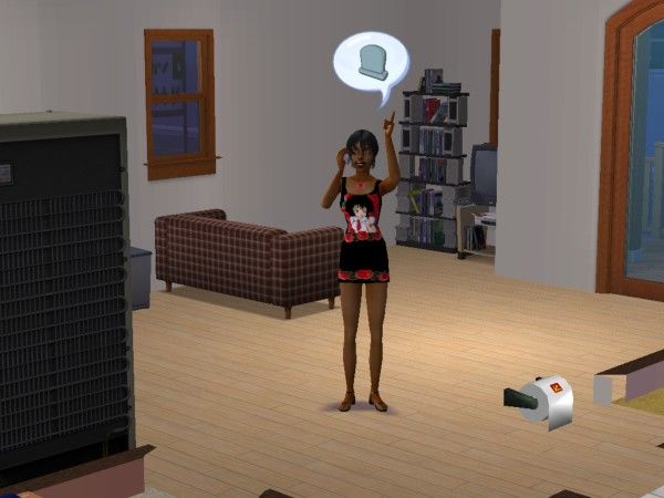 Pic of the day: "We are going to starve to death, mark my words, STARVE TO DEATH! The taxes are killing us!" Lissa, with clothes this time. Sims2: The Near FutureI am not talking about "Pets", the next expansion pack to Sims2, even though it is indeed slated for the near future. I have never been so unexcited over any Sims expansion pack, neither for the original game nor for Sims2. I remember the corresponding expansion for the original Sims; it was called "unleashed" and contained several nifty extensions to gameplay: A much larger neighborhood, gardening with edible food, and a new shopping neighborhood with a more rustic style. Despite this, this was the only expansion pack I did not install on my next computer. I found that the pets added nothing to the game except more work (well, unless you were single and lonely, I guess). They distracted my guests so I could not so easily make new friends for my human Sims, who needed them for their career. Then there were the strays who peed on my property during the night, and in the corners at that, so my Sims had to get up an hour or two earlier to clean up before they went to work. And yes, strays too distracted my guests. In addition there was sloppy coding that made my Sims move erratically. Un-recommended. Pets is not yet announced to contain anything except pets. I already have Nintendogs, which I don't play anymore. I don't need another pet game to not play either. ***Luckily I don't need a new expansion pack to make the game exciting. These days I get up earlier in the morning so I can play The Sims 2 before I go to work. What is so exciting? Well, the bed with added freewill is part of it (although it is not quite exciting in THAT way, you know, arousing) but there is also more realism, which I have added myself. I'm fed up with my Sims rolling in cash even though I never use money cheats and indeed often choose to focus on other things than riches. I know some players build these huge, intricate manors which cost a lot, but I don't do that. And the sheer lack of realism puts me off. I know the game is not meant to be quite real, but there are so many realistic parts: Pregnancy, stinky babies, flies if your garbage is not taken out (or if the can is kicked over by a spurned lover) ... even death is in the game. But the bills are just not up to the easy money, so money more or less loses its meaning after the first days. That's why I created the Near Future scenario: In the Near Future, some 10-15 years from now, everyone has a computer and Internet access. The first object in your possession should be Monique's computer from Mod The Sims 2. You'll need it, as you'll soon see. In the Near Future, people don't get handouts when they establish a new family. Borrow 20 000 using the computer and pay back the handout for your founder. Monique's computer will take care of calculating interest and adding payment to your bills. You can pay back the loan faster if you can afford it. In fact, you should. You will have other things to spend your money on than interest, this time around! In the Near Future, college is mandatory. Unless you have a college degree, you won't get a job. Ever. And no pension either. Hopefully you'll paint some masterworks eventually. You can also work as an independent blogger using the computer, or invite people in and play music for tips. There are a lot of ways to earn money, some of them quite fun, but none that will make you rich. Well, except marrying the mayor, I guess. In the Near Future, a college degree will not land you a boss job. You have to start at the bottom and be glad to have a job at all. (Use the paper instead of the computer while looking for work.)