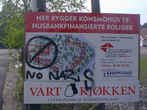 Pic of the day: No, neither Konsmohus nor "Vårt Kjøkken" ("Our Kitchen") are known for their nazism. Their only crime would seem to be providing a flat surface for the anti-nazists to spray on. Reversed menaceI don't think people are plagued by this overseas, but several countries here in Europe has some of it. It seems that we have aquired some reverse nazists. These anti-nazists, or sometimes anti-racists, are basically doubling the trouble we already have with sporadic witless wannabe nazists. Who of them is more insane is an open question. At first thought, you'd think that anti-nazism would be a good thing, or at least harmless. After all, the nazis were the bad guys. They tried to make of the Earth a hell forever, and eventually the good guys had to confront them in the most horrible war ever, before they were defeated. Shouldn't we all be anti-nazists? No, we should be democrats, or at the very least adherents of freedom. But anti-nazists are like nazists, only with the colors reversed. Their activities range from fairly harmless ones like spraying paint on other people's property, to unprovoked violent assault. And in their madness, they tend to regard both police and most political parties as their enemies. Nobody except them understands that the nazis are coming and have infiltrated our society. Oh, and incidentally they hate the Jews. The Jews are nazists too. ***Apart from the few and scattered loony thugs, there is a larger and more legitimate political movement. These labor tirelessly to convince the populace that several (or even most) of our political parties are racist and should be forbidden. They may have a point as far as racism is concerned - Norway is a lot more open to immigration from Europe than from other continents. That's mostly a question of culture, though. When I was a kid, there were very few people of non-Nordic origin here in Norway. But some childless couples adopted children from Africa or Asia, where there were always plenty of orphans. The kids grew up here and spoke Norwegian and acted Norwegian, and people found it kinda exotic in a good way. Now, these same kids (now adults) are searched by the police routinely, and people shout insults at them in streets and bars. Well, not all people, but it happens way too regularly. What happened? What happened was that immigrants of the same colors came to Norway, and unlike the small kids they brought their culture with them. Their culture was not like ours, and we had learned in school that ours was simply the best. So when they did not give up their primitive inferior culture and adapt to our God-given wonderful Norwegian way of life, we were deeply offended. So you don't want meatballs in brown sauce? Go back to the bush and die from starvation as befits your race! Boo! Boo! So yes, there is some racism here in Norway. It would be kind of nice to get rid of it. But it does NOT HELP when these guys and girls bring out the wall to wall paintbrush and paint everyone in nazi brown who want to preserve the Norwegian, or at least European, culture. There may be some doubt as to whether the Norwegian culture, such as it is, is worth preserving. Actually it is in a flux, like all other advanced cultures. We absorb new traits quite peacefully every year. When I was a kid, pizza was pretty much unknown and we had recently got yogurt. Now kebab is part of Norwegian cuisine, and middle-aged people dance samba. We're part of the global melting pot, or at least salad bowl. It is mainly the speed of the change that is open for debate. ***I have said this before, but I will briefly repeat it in this context. You don't need to forbid nazist propaganda, or communist propaganda. They are both ridiculously stupid and consist of a heap of big fat lies. Even in their current sad state, most humans can see at a glance that these ideologies don't hold water. A few confused souls will cling to them, but then again they would probably have clung to something else equally weird in the absence of these ideas. Some people simply feel a need to oppose society. But forbidding thoughts is not the solution. Forbidding thoughts is the problem. And opposition to unwanted ideologies does not give you a right to perform acts of violence or vandalism. "Beware of he who would deny you access to information, for in his heart he dreams himself your master." (U.N. Commisioner Pravin Lal, Alpha Centauri.) Truer words were rarely spoken by a fictional character... |